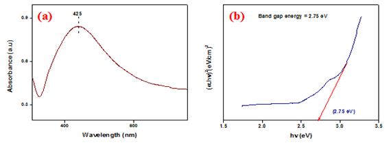 Figure 5A shows the ambient temperature UV–vis spectrum of the silver NPs. The maximum absorbance was obtained at 425nm (confirming the formation of silver nanoparticles) due to surface plasmon absorption.26 A Figure 5B show the obtained band gap value was 2.75eV; this value has been confirmed by indirect calculation from the absorption spectra using Tauc’s equation. The calculated band gap of silver nanoparticles is useful for the photocatalytic activity.
