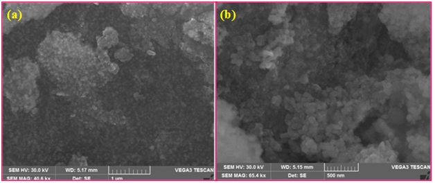 SEM images of Ag NPs are shown in Figure 6A & 6B. From the SEM images, it is clearly confirmed that the material synthesized by greenway is almost uniform spherical in nature. The particles are agglomerated crystals and look like a spherical like structures.27