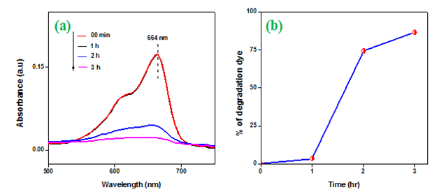 MB is a carcinogenic dye, the Photocatalysis of MB dye was carried using synthesized silver nanoparticles at varying time intervals in the visible region. Figure 8A shows that the rate of the absorption band of MB from UV-vis spectrophotometer at 664nm. So, it is observed that the 5ppm/100mL of MB undergo 87% in a period of 3h as shown in Figure 8B.