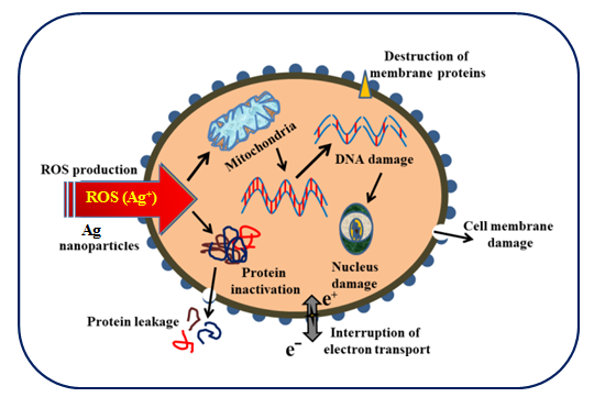 Cell membrane with negative charge and silver with a positive charge mutually attract. Supplementary, silver ions enter into the cell membrane and react with the thiol groups present on the cell membrane and destruction it leading to the death of the cells. Considering the above facts, the probable schematic diagram is shown in Figure 9.28,29 The significant antibacterial properties of silver nanoparticles were assessed by taking Gram-negative Pseudomonas aeruginosa, Klebsiella aerogenes and E-coli and Gram-positive Staphylococcus aureus bacteria’s using disc-diffusion technique.30–33 In the disc-diffusion technique, the silver NPs shows significant antibacterial activity for all (Figure 10). The measured zone of inhibition was revealed in Table 1.
