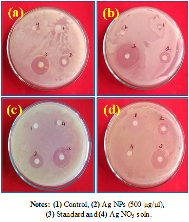 Figure 10 Antibacterial activity of green synthesis of Ag nanoparticles against pathogenic bacterial strains such as (A) Klebsiella aerogenes, (B) Staphylococcus aureus, (C) Pseudomonas aeruginosa and (D) Escherichia coli.