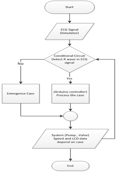 The designed LVAD is consisted from four major parts: ECG recording system, controlling system, blood pumping system and emergency system. As shown previously in Figure 2, these systems are worked synchronously with the other chambers of the heart. If any changes in the heart beat occur during the operation, the LVAD will respond quickly. The general flowchart that describes the flow of information between system components is shown in Figure 3.The recorded ECG signal is directed to the conditional circuit to be analyzed in term of R-wave detection. The detection of R-wave means that the heart is still pumps but can't provide the body with a sufficient amount of blood. It used also to determine the required flow rate according to the body needs. If R-wave is not existed in the ECG waveform the emergency system will be activated and the pump will work in a constant average rate 75 BPM to ensure enough blood supply to the body for survival. In emergency conditions sound and light alarms will be fire to warn the patient.
