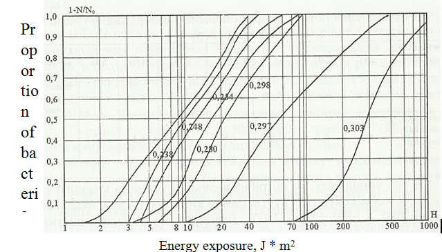 To solve the problem of environmental pollution, a distributed disinfection system based on the use of energy-efficient ultraviolet LED light sources is considered. This makes it possible to place bactericidal plants near each source of infection, which makes it possible to avoid the re-development of microorganisms, because when exposed to organic cells of various pathogens by ultraviolet radiation of spectral composition from 200 to 400nm, cell destruction is observed. Since the purpose of the installation of ultraviolet radiation is to neutralize bacteria, the bactericidal properties in them must have only photons with energy that can break the bond of protein molecules by radiation with a wavelength λ<300nm. Analysis of the graphical dependences shown in Figure 1, leads to the conclusion that the greatest efficiency of bactericidal installations is provided by light sources with a wavelength of 254-258nm. The Nippon Telegraph and Telephone Corporation's research laboratory, led by Dr. Yoshitaka Tanyas, has developed aluminum nitride-based diodes that can emit light in the ultraviolet range with a wavelength of 210nm. Their use is able to provide distributed disinfection of a significant amount of contamination of elements located on a large plane. However, the widespread introduction of such light sources in bactericidal installations is constrained by the lack of programs and methods of lighting calculation of installations based on them.