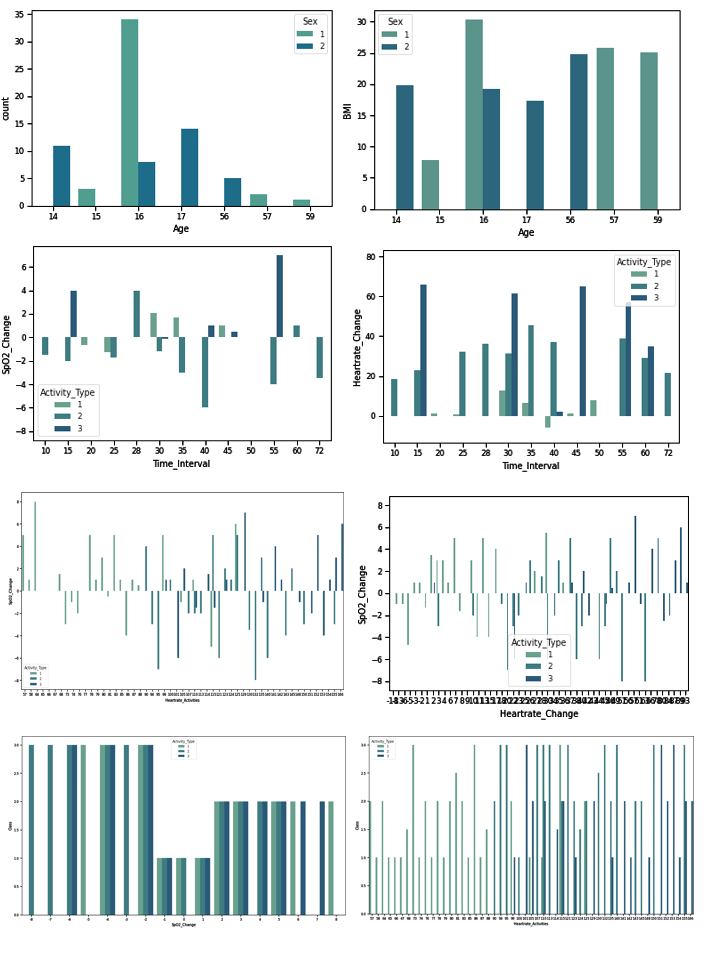 From the top leftmost to the bottom rightmost of Figure 2, it shows the number of samples collected for various parameters, including age, sex, BMI, the change of blood oxygen SpO2 level in percentage for each activity, the change of heartbeat rate in beats per minute during each activity, the time duration in minutes for each activity, the change of blood oxygen SpO2 in each target, the resting heart rate distribution for each target before each activity, and the heart rate distribution for each target after each activity. We found that going for a short walk outside can increase the blood oxygen level, and more oxygen is needed to supply to the body. We observed that consuming certain foods can also increase the SpO2 levels in the body, but the heart rate was almost at no change. This can be attributed to the fact that some foods are rich in oxygen-carrying components, which can boost the oxygen levels in the bloodstream. However, when it came to exercising, we noticed that the SpO2 level tended to decrease. This is because the heart rate is increased during exercise. As a result, the SpO2 level dropped as more oxygen was consumed. Additionally, we noticed a change in the participant's heart rates during walking. The body's increased demand for oxygen causes the heart to pump faster to meet the oxygen supply. The collected data also showed that the activity duration length impacted the heart rate and the body's oxygen levels. At high levels of physical activity over a long period, the participant's heart rates increased significantly, and oxygen levels decreased in the blood because the body had to sustain the activity longer.