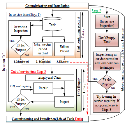 The rate of maintenance alongside the life of the AST depends upon each other. Minimum maintenance is required when the tank is newly manufactured.3 As the time goes by the integrity of the AST starts to decline and likely to cause decommissioning. One of the main reasons behind this is the corrosion of the tank. Interval maintenance is the only way to prolong the life and the quality of any AST. It can also decrease possible damage to it. Presently out-of-service period is an important and expensive procedure part of the maintenance process. In this period, the tank is emptied and cleaned for inspection. After inspection, it has three outcomes:3