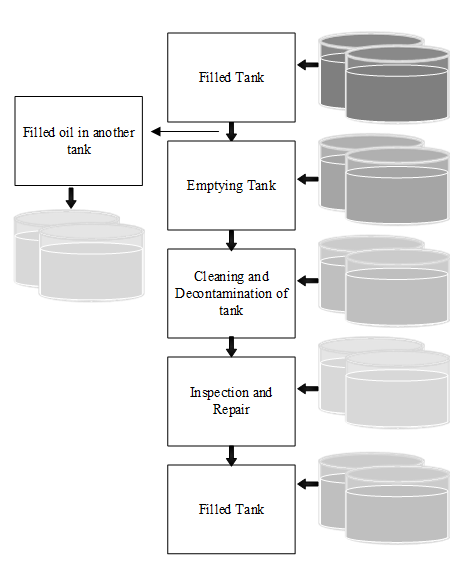 Figure 3 Maintenance cost increased extremely higher when cleaning process, non-productive and reduced service time taken into account. Oil transferred from affected tank to another healthy tank, which adds cost of renting or buying spare tank as well. Outline of the out-of-service for maintenance in petrochemical industry showing steps taken before inspection and repair. Reduced service time is not only the costly step, but emptying and filling oil in alternative tank is in itself very expensive. (Original figure presented in [1]).
