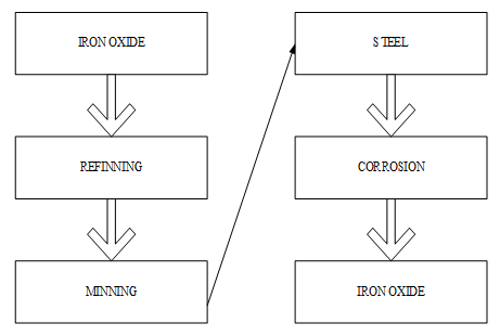 Figure 4 Usually ASTs storage are made of steel. Main reason behind using are, they are cheap, strong and easily store large amount of oil. Left hand side shows the refining step to make steel, right hand side is showing corrosion effects on steels. Life cycle of ASTs and corrosion are related with each other. More corrosion in tank means short life cycle. (Original figure presented in [7]).