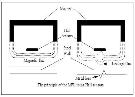 Magnetic lines of force are produced within the plate, when a magnet is close to a steel. These magnetic lines (flux) preferably like to travel within the plates than the air. A suitable powerful magnet creates saturated flux within the plate. Coil or Hall Effect sensors can be used to detect corrosion in the tanks; the corrosion can be identified by any irregularities fluctuation in the magnetic flux.6 Coil sensors works on the principle of Faradays law and the Hall Effect sensors which generate a voltage signal dependent on flux density (Principle of Lorentz force). Magnetic flux leakage principle can be understood by solving Maxwell equations.6 The differential forms are (Figure 5)