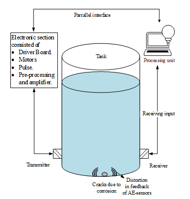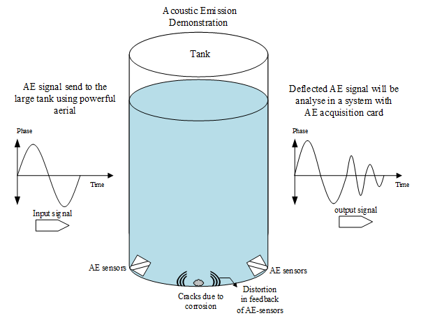 (AE) is the process in which sudden release of energy from a material will be detected in the form of elastic waves,11 and it has been widely used as a non-destructive-testing tool. In the recent years, the A.E application for detection of corrosion on the floor plate of ASTs is being adopted by petrochemical companies. The use of acoustic emission started first in the early 1980’s for examining the floor of the tanks.10 However, it was considered an unreliable method, as this technology progresses, the acoustic emission shows promising results. For in-service maintenance, tank owners don’t need complex testing methods to tell us about leaks or corrosion in the tank. They need a much prominent method that will update the floor's condition, so that any inspection to repair can be completed before any loss in the form of leakage or damage to the tank has occurred. A.E is a non-destructive method that can be used to monitor corrosion. In A.E, we don’t need to enter the tank to determine its condition. “AE testing has many benefits such as on-line testing, global monitoring, rapid inspection, and cost reduction”.2 This method has taken an on-line root for corrosion detection, and it still can’t be treated as an in-service inspection technique. This method may be defined as a semi-in-service technique. In this method, ASTs are still undergoing off-service for a small duration. Before the tanks are tested, they need to be shut down anywhere between 6 to 12 hours, including all agitators, heaters and oil pipes.4 AE has the potential to replace current inspection techniques because the large tank doesn’t need emptying or cleaning. However accuracy of the AE has raised some questions. Factors effecting the AE results are discussed below:-