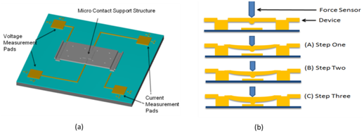 Using this test stand, FC and RC were simultaneously measured during two test profiles, an initial contact test (ICT) and a cold switch test (CST).9,16 During ICT, an external point load was applied to the top surface of the micro-contact support structure while sensor displacement and force were monitored during support structure deflection. Once electrical contact was initiated between the upper and lower contact surfaces, the measured force is classified as contact force. For this work, ICT profiles were conducted for every cycle where a contact resistance measurement (i.e. Rc versus FC) was required. During testing, the system was automated to increment the force sensor position, in nanometer-sized fixed steps, until the force sensor limit was reached. Since the micro-contact support structure required approximately 1mN of force to fully deflect, the available sensor force for each contact resistance measurement was approximately 1mN. On the other hand, during CST profiles the force sensor displacement needed to apply approximately 200µN of force to close the micro-contact and then current was applied across the micro-contact to simulate use. During this test, the current was applied only once the contact was fully closed and it was then removed prior to breaking contact. These steps are then repeated for the desired number of cycles at a maximum frequency of 3kHz.13-17