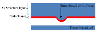 Contact materials also have a major role in determining the performance and reliability of micro-switches. Hardness, as well as conductivity and other material properties influence the contact resistance. Gold, palladium, platinum and alloys are commonly used micro-contact materials due to their high conductivity.8,19 Since these materials are very soft and wear easily, other materials are required to enhance the lifecycle and the performance of the micro-contacts. One of the promising material is gold-carbon nanotube (Au-CNTs) composite. The high Young's Modulus and low resistance of CNTs makes them suitable candidates for micro-switch contacts. For instance, contacts consisting of single-walled CNTs coated with a thin Au layer were shown to have a resistivity between 1- Ωm.20 CNTs have been reported to have an elastic modulus of approximately 1TPa, which is comparable to diamond's elastic modulus of 1.2Tpa.20 Yunus et al.20 explored two contact pairs with carbon nanotubes: Auto multiwall carbon nanotubes (MWNTs), where one electrode is Au and the other is MWNTs coated with a thin Au film so the contact interface is Au-Au.20 Figure 5 shows a cross-section of a micro-contact support device with a hemispherical upper contact bump and a planar lower contact. The novel contact material is located on the surface of the upper contact bump.