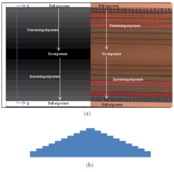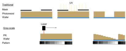 The ability to develop 3D micro-structures is of great importance for increasing optical and electro-mechanical device performance. Previous technologies used multiple direct writing and photolithography steps, or customized equipment.21-25 However, these technologies are restricted to a limited range of shapes and do not utilize batch processing. Gray-scale lithography (GSL) has emerged to develop 3D micro-structures in various materials.25-27 The use of gray-scale technology allows unique 3D shaping to be performed in a single photolithography step with subsequent dry etching for pattern transfer.27 Gray-scale lithography utilizes a “virtual” mask patterned with varying intensities of gray pixels and spacing. This virtual mask is used to control laser intensity in the lithography system. Changing the size of the pattern and the shade of gray, varies the intensity of the laser power; with each distinct power level corresponding to a gray level. The height profile in the photoresist after development (composed of photoresist gray levels) will depend upon the incident intensity, time of exposure, and photoresist contrast. Gray-scale and traditional UV lithography are pictorially compared in.Figure 7