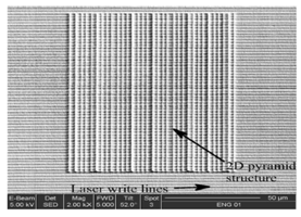 Gray-scale “virtual” masks were designed and used with a Heidelberg µPG101 UV laser lithography system to produce GSL structures in positive photoresist.28 The varying levels were patterned by changing the intensity of the laser, which was controlled by the assigned gray-scale value in the virtual mask design. Due to limitations in controlling the Heidelberg’s UV laser, only 100 out of the total 255 possible gray scale variations were used to produce 100 unique height levels.28 This limitation led to a stepped profile in the photoresist illustrated in Figure 8.28 The resulting gray-scale levels are readily apparent in the photoresist as color variations shown in the optical image below (Figure 8A). The virtual gray-scale lithography mask was incorporated into the overall traditional lithography mask set design by manually aligning the Heidelberg system, using already fabricated device features, to guide where the 2D pyramid areas should be placed. This method was labor intensive, but with the addition of a few actual alignment marks on the wafer, acceptable alignment onto the lower contact pad was possible. Scanning electron microscope (SEM) image of a series 2D pyramid structures, etched into the Si wafer using reactive ion etching (RIE), are shown in Figure 9.