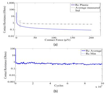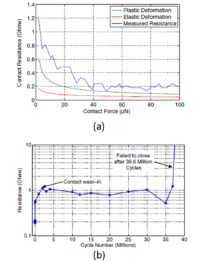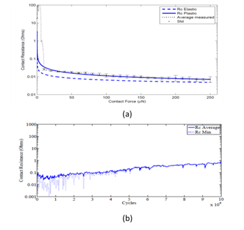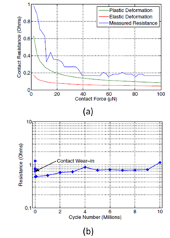 Figure 12 is ICT and CST data for an Au-CNT composite upper contact in a hemispherical on lower planar contact pair.17 The ICT (Figure 12A) compares modeled values for micro-contact resistance to measured data. The plotted data is an average of 15 ICT measurements.Figure 12A shows that at extremely low contact force, less than 40μN of contact force applied, initial contact resistance mimics the plastic deformation resistance model. The offset between plastic model and data could be a result of surface topography or contamination. The CST results Figure 12B show an initial contact resistance at ~1.22Ω until contact wear-in and then a relatively stable contact resistance ranging from ~0.5Ω to ~0.7Ω at ~9×106 cycles. The device failed closed (1.1Ω) at ~107 cycles. Overall, these results are similar to the Au-Au, hemisphere on flat shown in Figure 10.