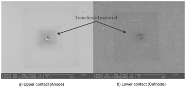 Figure 16 is ICT and CST data for an Au-Au, hemisphere on engineered lower contacts pair (i.e. 2D pyramid area).16 The ICT compares modeled values for micro-contact resistance to measured data. The plotted data is an average of 15 ICT measurements; also shown is the standard deviation of that data. The data shows a very stable contact resistance (i.e. ~1.0Ω) across a wide spectrum of applied contact force values (i.e. ~25µN to ~200µN). This is due to the engineered, fixed geometry 2D pyramid lower contact. Essentially the contact resistance was “dialed in” by imprinting a fix, alternating high/low area onto the lower contact. This hypothesis is supported by Equation 1 that shows the contact resistance is inversely proportional to the contact area through the effective radius (i.e. a) of a conducting “a-spots”.19 The CST results (Figure 16B) show a stable, low contact resistance that linearly decreases from ~0.9Ω to ~0.5Ω up to 107 switch cycles. These results support the thesis that developing contaminant films are being actively shed off conducting area into the “valleys” of the lower contact. The CST test was halted to maintain test data consistency not because the micro-contact failed. The data presented, thus far, in the sections (A-C) were composed of either Au-Au or Au-CNT composite contact materials with either hemisphere on flat or hemisphere on 2D pyramids. So far all of the load polarities set to the upper contact as the anode and the lower contact as the cathode.