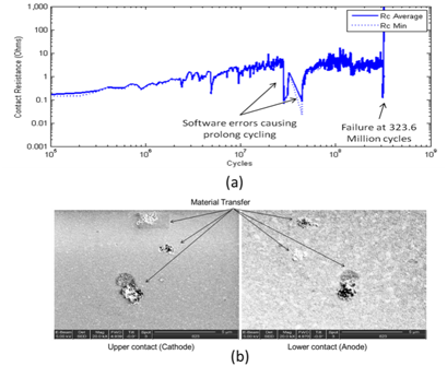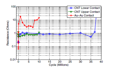 Figure 13 is ICT and CST data for an Au-CNT composite lower contact in a hemispherical on lower planar contact pair.17 The ICT (Figure 13A) compares modeled values for micro-contact resistance to measured data. The plotted data is again an average of 15 ICT measurements. Figure 12A shows that at extremely low contact force, less than 50μN of contact force applied, initial contact resistance mimics the plastic deformation resistance model. The offset between plastic model and data could be a result of surface topography or contamination. The CST results (Figure 13B) show an initial contact resistance at ~0.19Ω until contact wear-in and then a relatively stable contact resistance of ~1.0Ω through ~36.9×106 cycles and then a failed open device at ~39.6×106 cycles (>10.0Ω). These results show similar trending to the Au-Au, hemisphere on flat data provided in Figure 10 the Au-Au contact pair showing better performance through 5×106 cycles and the Au-CNT composite lower contact showing more stable contact resistance up to failure at ~40×106 cycles. Figure 14 is a comparison of lifetime data for three hemispheres on flat contact pairs with three different contact metallurgies: Au-Au, Au-CNT composite upper contact, and Au-CNT composite lower contact.