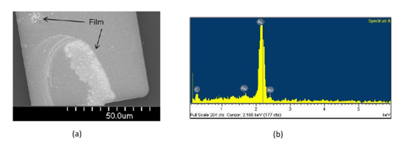 The Au-Au micro-contact exhibited steadily increasing contact resistance as the number of actuations increased. This particular micro-contact was cycled nearly ~10×106 cycles, at which point the closed contact resistance was ~14.4Ω (i.e. failed open). The CNT composite films, however, in either the lower or upper contact did not display this same steady rise in contact resistance. The micro-contacts with CNTs in the upper contact was also cycled to ~10×106 cycles, at which point the contact failed closed with a resistance of ~1.1Ω. Finally, the micro-contacts with an Au-CNT composite film lower planar contact was cycled to approximately ~40.0×106 cycles with a closed contact resistance of 1.21Ω being measured just before the device failed to open (i.e. high contact resistance). This failure was most likely due to the build-up of an insulating contaminant film. The most promising results were with the Au-CNT composite film in the lower planar contact. This micro-contact pair exhibited much lower and consistent resistance compared to a similarly constructed Au-Au micro-contact pair. This could be a result of the CNTs providing a highly conductive thermal layer to diffuse joule heating and thus allow for a longer lifetime. The Au-CNT film may have also allowed some current to flow through the CNTs, thereby reducing resistance in the contact film. After cycle testing, the Au-CNT composite lower contact was examined to determine the failure mechanism. SEM imagery of the lower contact (Figure 15) revealed an area of contamination had developed while testing this contact metallurgy. To further evaluate the contaminate film, energy dispersive spectroscopy (EDS) data were collected at a relatively low voltage (i.e. 2.185keV) to minimize penetration depth. The resulting SEM image and EDS are shown in Figure 15.