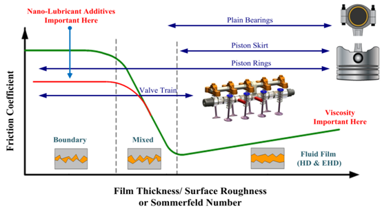 Stribeck curve describes the friction levels of contacts with different film thickness to surface roughness ratios with lubrication regimes of the major components in automotive engines such as piston rings, engine bearings and valves as shown in Figure 1. Internal combustion Engine lubrication is categorized into three main regimes: boundary, mixed and elastohydrodynamic lubrication.1 In piston rings/liner assembly, the previous lubrication regimes can be obtained over the stroke depending on operating conditions. Generally, boundary lubrication exists under the effect of low speed and high load conditions.2 Hence, nano-lubricant additives are very important in boundary lubrication because of the higher friction coefficient.3 Current challenges for reducing the friction and wear require an adaptable lubricant for different operating conditions. Thence, most researchers have focused on nano-lubricant concept in the internal combustion engines as the main strategy for suppressing the friction coefficient and the wear of contact surfaces, in a manner that will ultimately lead to an improved tribological performance.4 The main advantages of the nanoparticles additives compared to conventional lubricant additives are stated as follows:5