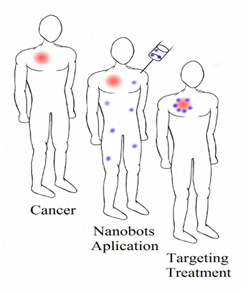 In near future, nanobots will play an important role in medicine, like a “nanodoctor” inside the body. The cancer treatment has a special interest because is one of the leading causes of death in the world.42 The nanobot will move independently around the body and detect a cancer cell, Figure 1. Therefore, when are inside or interacting with the cancer cells they will release the drug. In this way, the side effects of anti-cancer drugs on other parts of the body will be reduced.43 In addition to the cancer drug attack, some nanoscale robots can destroy cancer cells through thermal necrosis when a non-invasive external source of heating or stimulus will be applied. As example, super magnetic beads that can penetrate and destroy cancerous tissues with a magnetic field.44