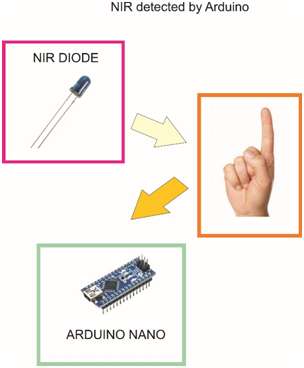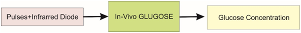 The problem of model calibration along with the short periods of validity appears in all the modeling using static models and NIR (see).2 To overcome this issue to account for patient variability, a dynamical model: Pulses in an infrared diode-Glucose concentration is proposed. Assuming the glucose’s level as a dynamical system’s output, the block diagram depicted in Figure 1 can be described. The complete survey2 described that blood glucose concentration can be more effectively detected in the range of 1408nm to 2326 nm. However, lower wavelength can be used to detect glucose concentrations as well (see for instance).6 The clear advantage is the low cost of 980nm infrared diodes that can be used to implement NIR detection. Moreover, the available literature makes use of NIR through skin tissue (see for instance),7 this technique needs a complex and complicated hardware. To overcome this issue some papers describe the use of reflecting NIR (see for instance,8 in this paper, NIR is used taking measurements of the infrared rays returning after shocking the skin tissue (Figure 2). It turns out that the returning infrared ray must be used to extract glucose concentration. To this end, a cheap NIR commercial receptor is used and converted to digital (A/D) with a 10 bit low cost Arduino Nano platform.
