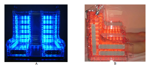Figure 1 The biophotonic device Barva-CDC for the diabetic foot treatment: A – general view of the unit with UV light turned on, B – feet location in the unit with IR+red light turned on.