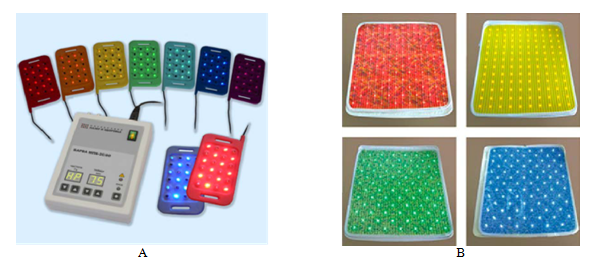 This type of photonic applicators have been designed for prevention, treatment and rehabilitation of the most common human diseases: myocardial infarction, stroke, hypertension, hypotension, influenza, tuberculosis, pneumonia, bronchitis, asthma, gastric ulcer and duodenal ulcer, osteochondrosis, vascular dystonia, neuralgia, sinusitis, otitis media, arthritis, arthrosis, allergies, prostatitis, andexitis, injuries, burns, frostbite, and others needed local heating and activation of local tissues and their microcirculation. Several types of the applicators can be helpful (Figure 2). The units designed for local applications are composed of 24LEDs (Figure 2A) while the units for the distributed purposes have 120LEDs (Figure 2B). The pulsed control unit MPB-2S/80 ensures the operation of the unit in continuous, pulsed or scanning modes. The scanning is performed according to the modulation frequency of the luminous flux. Also the unit can be used for dosing of the phototherapeutic procedure according to the duration of the irradiation. The main technical parameters of the unit MPB-2S/80 are given in the Table 4. The first unit can be used for local treatment of small local areas 10x12cm, while others are applicable for the treatment of back, high and low extremities. High therapeutic effect of both units have been shown during the detailed clinical trials.42 The same combinations of the colors for activation of the photo induced reactions in the cells and tissues with IR radiation for local heating and intensification of the microcirculation have been chosen (see §5.1).