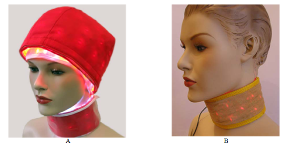 Therapeutic influence on the head needs a delicate approach. Special phototherapeutic units for the prevention and treatment of neurological diseases caused by acute or chronic cerebro vascular accident, Alzheimer's disease, Parkinson's disease, meningitis, herpes viral encephalitis, migraine, epilepsy and other brain diseases have been elaborated (Figure 3A). Such diseases are difficult to treat with drugs or other physiotherapeutic procedures. The proposed treatment cannot substitute the drug therapy prescribed, and can be used as a complimentary measure that can enhance the main treatment and accelerate the recovery. The photon units Barva- CNS are manufactured as a hat that can be adjusted to any size of the head (Figure 3A) or neck (Figure 3B). Its application allows reducing the duration of treatment of neurological diseases by 2-3 times depending on its severity, and significantly increases the efficiency of drug therapy. The first type of unit (Figure 3A) is designed for the problems caused by acute or chronic insufficient cerebro vascular blood circulation. They can also be used for treatment of the skin and hair problems like alopecia and others. The units contain 228 or 240 LEDs depending on their type and size. The most efficient combinations of colors with IR radiation are the same as in §5.1. The second type of unit (Figure 3B) is designed for the prevention and treatment of otolaryngological (sore throats, pharyngitis, laryngitis) and neurological diseases (neck osteochondrosis, etc.). The technical characteristics are similar to those presented in Table 3. The restoration of blood microcirculation in the ischemic zone allows elimination the cause of the pathology development and ensuring rapid recovery.