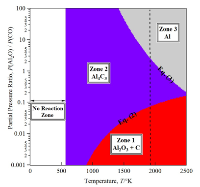 Figure 1 Al-O-C Phase diagram for the partial pressure ratio of gaseous species Al2O/CO. This diagram shows the variation of the partial pressure ratio Al2O/CO and temperature impact on the reduction of alumina to aluminum based on calculated data from MALT2.