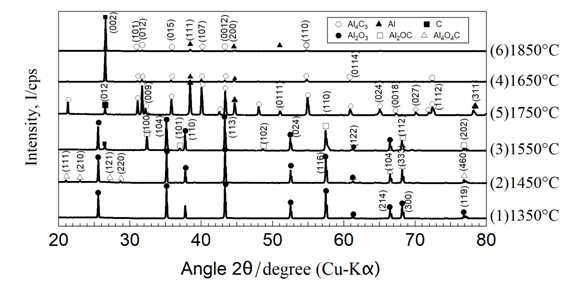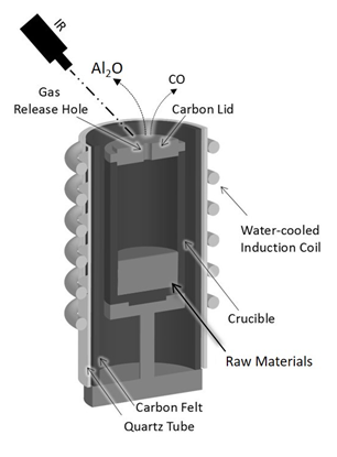 Figure 2 shows an illustration of the heated crucible via the induction furnace; the crucible is made of a high-purity graphite material with an inner diameter of 40 mm and a height of 70 mm. The induction heating furnace generates a power of 30kW (Toei Scientific Industrial CO, Ltd) containing a power supply and a vacuum chamber connected with a quadrupole mass spectrometry (Q-mass) to analyze the gas species generated during the reduction process. Six mixtures of alumina (diameter 20~100 um, Taiheiyo Cement Corporation Japan) and glassy carbon (diameter 20 um, Tokai Carbon Ltd), were prepared with same molar ratio of raw materials (Al2O3:C) = (1:2) and heated with different heating patterns to achieve a heating-temperature comparison between the six samples starting from 1350ºC with sample 1 with a 100ºC increasing step to finally reach sample 6 with l temperature of 1850º as shown in Table 1. The prepared raw material mixtures are shown in Table 2 in which the mass balance of the six experiments is illustrated.The six samples were installed in the graphite crucible, and it was placed at the center of the induction furnace heating coil. While as a protection of the crucible surrounding, it was covered with a thin layer of carbon felt and inserted into a quartz tube as insulation.