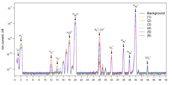 Figure 4 Mass spectra of the chamber gases during the heating in case of six heating temperature profile. The amount of CO gas increased with increasing the temperature. However, the highest produced amount was achieved for a heating temperature of 1750 ºC in the sample (5).