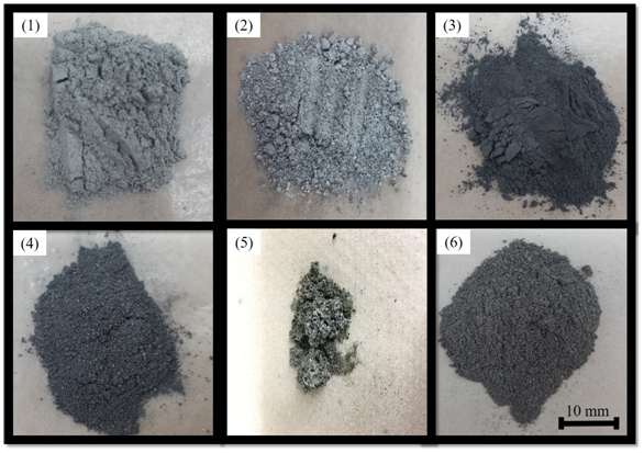 Table 2 illustrates the mass balance of the six samples including the amount of the input raw material, the amount of the obtained product which was calculated based on XRD analysis presented in Figure 5, and the weight loss in the form of gas loss in our case. The yield of the produced Al material is defined as the molar ratio of the Al element in the product divided by the molar ratio of Al in the total input raw materials containing Al element. The input raw material consisted of Al2O3 and C with the ratio of (1:2) in all six samples. The analysis of table 2 indicates that in the sample (1-3) there was no production of Al due to the total conversion of the produced Al2O from reaction (1), reacted with carbon to fulfill reaction (2) to generate Al4C3. The lower heating-temperature can explain these results which led to the minimum generation of Al2O and Al4C3 via reactions (1) and (2) and not allowing the occurrence of the reaction (3) to produce Al. Furthermore, reaching a temperature of 1650ºC in sample allowed the generation of higher amount of Al2O which its excess was detected via Q-mass which means left the crucible and Al4C3, in which their interaction led to generation of Al even with a low yield of 6%. Further increase of the heating temperature to 1750 ºC, engender a smooth and total occurrence of the reactions (1-3) which was awarded by obtaining the highest Al yield of 18%. An additional increase of the temperature for sample 6 led to opposite effect of lowering the generation of Al, and it is due to evaporation of Al2O due to a higher temperature which means that 1750ºC represents the optimum heating temperature for obtaining a higher Al yield of the carbothermal reduction of alumina. Moreover, these results is backed up by the real images of the obtained product in the case of each sample as shown in Figure 6, in which sample (1) and (2) shows a light grey color due to remain of higher amount of unreacted Al2O3 compared to sample (3) and (4) that shows a darker grey color due to remain of unreacted carbon in the product and due to generation of sufficient amount of Al4C3 and Al in sample (4). While Al was generated with higher amount in the sample (5) which shows a metallic color corresponding to Al material presence. Sample (6) shows a darker grey color mainly due to uncreated carbon and generation of a higher amount of Al4C3 which couldn’t react to produce Al.