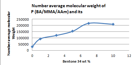 Figure 1B Effect of bentone 34 on the number average molecular weight of P(BA/MMA/AAm) and its composites.