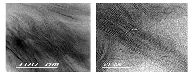 High resolution Transmission electron microscopy (HRTEM) is the most commonly used tool to characterize the microstructure of nanocomposites. Figure 3A illustrate the TEM micrographs of Bentone 34, where firmly and reportedly a regular sheet structure with particle sizes in nano scale Upon polymerization in presence of the bentone34, the polymers were observed finely intercalated in the layers of it as shown in Figure 3B, where the black lines are the cross section of aluminosilicate platelets, the platelets can be seen as a single and uniformly dispersed, this shows that the monomers had polymerized in the bentone 34 laminar and formed inorganic-organic hybrid. Such intercalation could be principally assigned to the improvements observed to both the mechanical and electrical properties of the polymer composite in addition to its thermal and anti-degradation aspects.