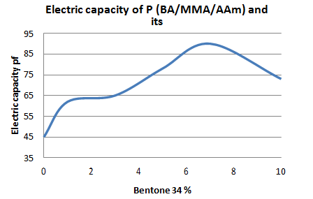 Electric capacity is defined as the ability of a body to store an electrical charge. So, a material with a large capacity holds more electric charge at a given voltage than one with low capacity. The volume resistivity and electric capacity of the prepared terpolymer and its composites were measured and are given in Table 7 & Table 8 and Figure 8A & 8B. As shown, the volume resistivity and electric capacity of the prepared terpolymer and its composites are acceptable according to cable specifications data, IEC 60502 and ASTM D1248-98. Upon addition of Bentone 34 to the terpolymer improvement to both the volume resistivity and the electric capacity properties were observed. This behavior can be attributed to the presence of nano filler materials may affects the space charge accumulation in polymer matrix.