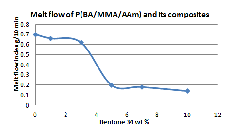 Melt flow index is a measure of how many grams of a polymer flow through the die in ten minutes. It is an important parameter for the fabrication of polymer especially if it is used as insulator or sheathing for the electric cables. The melt flow index (MFI) of the prepared terpolymer and composites was measured according to ASTM D128317 using ZWICK/Roell – Germany The melt flow measurements were given in Table 9 and Figure 9. The prepared terpolymer and its composites can be used as sheathing or insulating material according to ASTM D 1248- 98 categories 3, 4. Also, the presence of bentone 34 material in the terpolymers gives the same trend with a little decrease in the melt flow index. This can be attributed to the disturbance caused by the presence of Bentone 34 in the polymer matrix.