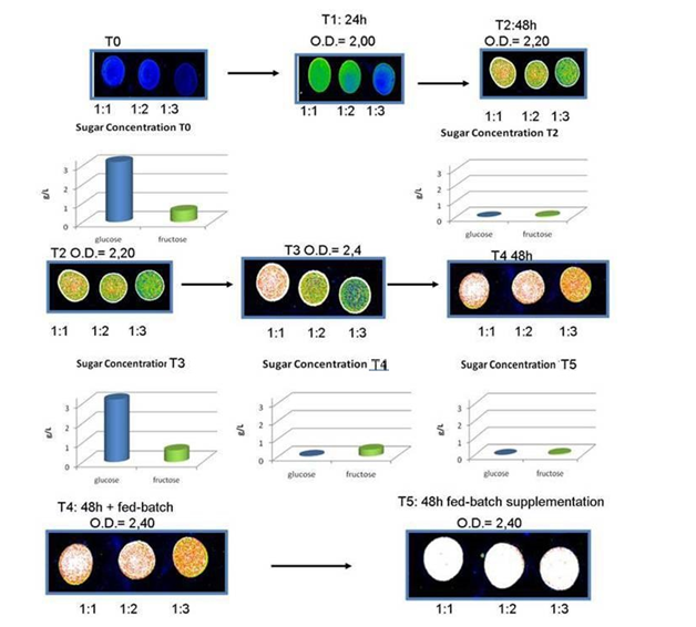 Figure 1 48 hour fermentation in biofermentor ad monitoring of PHB synthesis using Nile Blue staining of bacterial cells and sugars consumption using enzymatic kit. Bacteria were used as total suspensions or diluted 1:2 and 1:3 that were spotted onto glass slides and analyzed on an Affymetrix 428 array Scanner, at excitation/emission 460 nm/550nm. The dilutions showed increase in fluorescence until saturation of signal (white spots). T2 required addition of feed stock, until sugars were totally consumed (T4 and T5).