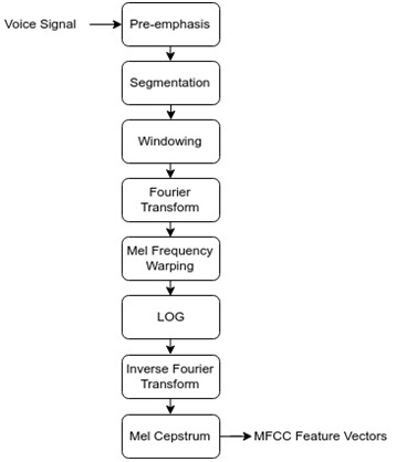 For the extraction of characteristics of audio signals, the algorithm MFCC (Mel Frequency Cepstral Coefficients) was used, because it presents a high capacity to discriminate the characteristics of voice signals.9 For the extraction of MFCCs an open source API called "python-speech-features" was used.10 Figure 1 shows the steps to which an audio signal is subjected to acquire the MFCC feature vector.11 Before starting the feature extraction process, the audio sample goes through the normalization step to ensure that all samples that make up the file have values between 1 and -1. Next, the normalized file goes through a pre emphasis filter to amplify the higher frequencies that have been attenuated due to the physical characteristics of the human speech system. Since the audio acquisition system records 2-second samples, an audio segmentation process based on signal energy variation that identifies the attack and the end of the pronounced word sustain has been developed. This procedure is necessary because only the part of the audio containing the word is sent for MFCCs extraction. Each segmented audio section is divided into 10 windows of varying length, and from each window the 13 most relevant coefficients for the speech recognition process are extracted. Therefore, each digit can be described as a feature vector of 130 elements. The use of windows of variable size is justified by the fact that they adapt to the length of each command, which varies from digit to digit.