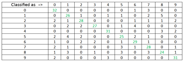 For the Artificial Neural Network12 (ANN) training process, an open source API called "Pybrain"13 was used. Initially, the 50 volunteers were separated into 44 for ANN training and 6 [3 women and 3 men] for trained ANN validation. A thorough analysis of the 132 samples of each digit from the 44 volunteers was performed and the corrupted samples were discarded with 88 samples remaining for each of the ten digits. Tests were performed to find the best setting for ANN. The tests consisted of varying the number of hidden layer neurons, the hidden layer activation function, the output layer activation function, the learning rate (which has a direct impact on ANN learning speed) and also the momentum rate (a constant that determines the effect of past weight changes on the current direction of motion in the weight space). The parameters with which ANN presented the best performance were: 130 neurons in the input layer; 36 neurons in the hidden layer; 10 neurons in the output layer; hyperbolic tangent as the activation function of the hidden layer; soft max as activation function of the output layer, 0.01 of learning rate; and 0.06 of moment. After trained ANN, it was validated using 18 samples of each digit from the 6 volunteers who were not used in training and who were recorded in a low noise environment. The average ANN hit was 88.3%, having hit 159 commands in 180 attempts. The details of the test can be seen in Figure 2 which presents a confusion matrix that shows, in the first column, the digits pronounced by the volunteers. Lines 2 through 11 show how each of the 10 digits was sorted by ANN. For example, in line 11, it can be seen that out of 18 times the number "9" was spoken, 14 times the ANN classified it correctly but on 4 occasions ANN classified it as the "4" digit.