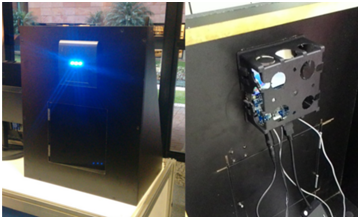 To perform the activation of the device that opens the door, an electronic board was developed. The board has as main components a 12V powered relay, an opt coupler and three RGB LEDs to facilitate user interaction. The Orange Pi Lite + electronics board set was then housed inside the box that was built to simulate a door. This box is illustrated in Figure 4. The prototype has, as a form of interaction with the user, 3 RGB LEDs that can show the colors red, green, blue and white. When the system is idle, the 3 LEDs turn blue. When the user pronounces a command to wake the system, which can be any word, all the LEDs go out and immediately only LED 1 lights up in white indicating the moment for the user to speak the first digit of the password. Two seconds after the first LED lights up, the second LED also lights white showing the user the moment to speak the second digit of the password. And finally, 2 seconds after LED 2 lights up, LED 3 also lights white indicating the time for the user to speak the third digit of the password. Immediately after the three digits of the password are pronounced, the system processes the information received and, if the password is wrong, illuminates the three red LEDs. If not, all three LEDs light up green and the door opening mechanism is activated.