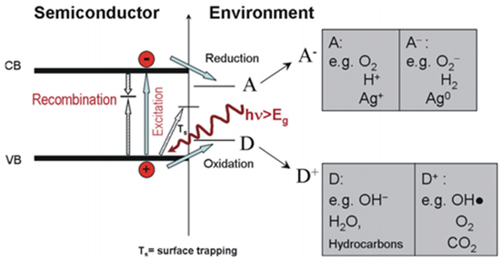 To understand photocatalysis and how it can intervene in the process of degradation of pollutants, it is necessary to understand the main reaction steps or stages thereof. This process begins when light of higher energy than the band gap, impacts a semiconductor such as TiO2, then the promotion of an electron is generated from the valence band to the conduction band, which creates a hole in the valence band (this as H +). The H +, together with the electron diffuse into the respective band of the semiconductor and then proceed to react with a redox species in the environment. When in water, the energy generated, not only allows the dissociation of the same into oxygen and hydrogen, but also favors the formation of radicals (OH •) (Figure 3). The latter are what make possible the oxidation of a large amount of inorganic and organic compounds.39 As the above mechanism, one of the main uses of photocatalysts is generate ROS known, also named as highly reactive oxygen species, which already mentioned that generally present as hydroxyl radicals explained (can perform degradation of organic pollutants). Photocatalysts can provide an efficient, cost effective and promising technology not only for the degradation of organic compounds, but for possible biological disinfection, including applications in the wastewater treatment.40
