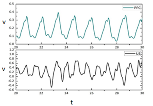 Figure 2 shows a graph of the same patient for the records obtained with the PPC (upper table) and measurements by US (lower table). In a similar way for each patient, the behavior of the signals showed that the graph obtained through the ultrasound data offers less information or a curve that is not well defined with respect to the PPC graph, that is, no clear and relevant information is shown for the medical diagnosis if the US is used. That is, while the ultrasound technique is not able to provide the dicrota wave, whose record is the objective of this work, the PPC technique shows it clearly and reliably. In such a way that as observed in Figure 3, in the graph of the PPC in each carotid pulse it is possible to recognize the anachron wave, the percussion wave and the dicrota wave. The anachron, percussion and dicrotic wave is observed in each pulse. On the other hand, although some test subjects were identified as healthy individuals, in Figure 4 the alternating pulse is observed, which is characterized by a sequence of a pulse of normal amplitude, followed by another one of smaller amplitude, in the context of a regular rhythm. This medical condition is observable in advanced heart failure, so in one perspective of this work is the evaluation and clinical comparison of the results obtained.