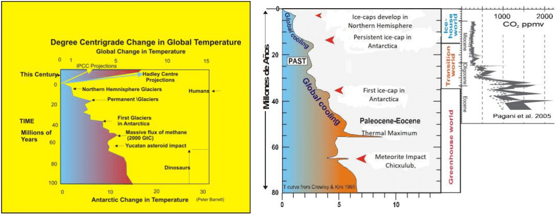 That important angiosperm evolutionary step helped bring down the carbon dioxide levels from more than 3,000 parts per million (by volume) to their pre-industrial concentration of 280 parts per million (ppmv). Meanwhile, the biomass converted to coal, which we have been burning indiscriminately once industrialisation got underway. In general terms, over the course of 100 million years, the temperature fell linearly from 7⁰C above pre-industrial global-average levels to that at the beginning of the industrial revolution some 250 years ago. Over the same period, carbon dioxide levels fell exponentially, with the greatest change occurring all those millions of years back. From the diagram we see that over the past 20 million years the temperature trajectory is more or less linear with bumps, but the CO2 atmospheric concentration shows the tail end of an exponential decline, with relatively little change. Yet, the cooling continued over those 20 million years from 2⁰C above pre-industrial levels (280 ppmv) to zero by the turn of the 19th century.7,8