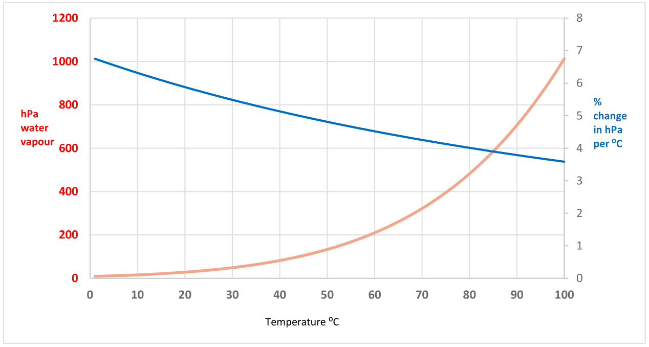 The brown curve (left-hand axis) is the hPa at saturation. The right-hand axis shows the percentage increment in saturation per degree temperature change. The X-axis is the temperature in Celsius.