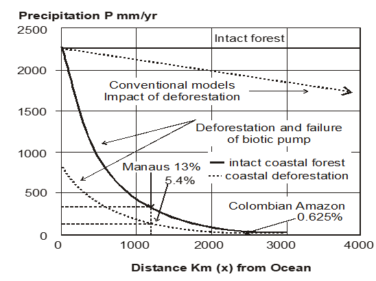If there is good forest cover all the way to the coast, then the biotic pump ensures sufficient rainfall by means both of evapotranspiration and by the cloud-forming implosion force, the latter drawing in the humid surface flow of air (the Trade Winds). Those twin processes ensure that the supply of humid air above the forest is sustained, with the consequence that the distance a molecule of evaporated water remains in the air appears to extend towards infinity. In fact, if the virtual length of the precipitation pathway of a water molecule extends to 5000 kilometres, the loss in precipitation, even thousands of kilometres distant from the coast, is negligible. If take the Amazon Basin as an example, the above formula indicates that, following deforestation, the closer to the coast the more rapid the reduction in precipitation. That simple finding tells us that first and foremost we should take good care to protect the forests close to the shore. Indeed, the curve of precipitation loss for a deforested Amazon Basin is exponential with the most rapid decline close to the coast and a levelling off several thousand kilometres later, when the annual rainfall would be no better than that we can expect for a desert as dry as the Negev in Israel.
