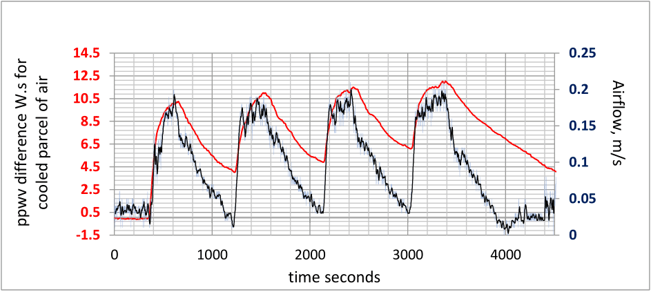 Experiment June 27th, 2016. The graph shows 4 refrigeration cycles. The left-hand axis shows the partial pressure change in water vapour in watt.seconds during the refrigeration cycle and the right-hand axis shows the anemometer readings in metres per second. The airflow was measured using a 2D- anemometer ©Peter Bunyard