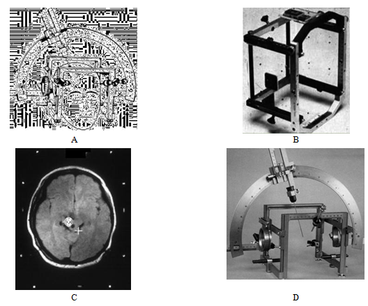 Figure 1 (A) Stereotactic frame with a head, (B) target localization box with fiducial marks, (C) CT slice of a head (white spots are fiducial marks) and (D) original Leksell stereotactic frame with surgical attachments