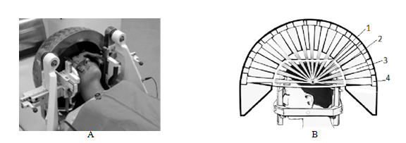 SI uses the image analysis techniques allowing determination the space coordinates of the target tissues in a given fixed system of coordinates.7-9,16 In the simplest case the cartesian coordinates of a head can be determined by the rectangle frame (Figure 1A) supplied with special fiducial marks (Figure 1C). The determination technique varies from the manual till Magnetic resonance imaging (MRI) and computed tomography (CT) with the marks tightly connected to the characteristic anatomical features of a head (Figure 1C) in three space projections. Then location of any detected target can be digitized in the 3D space coordinates. The original Leksell stereotactic frame with surgical attachments is presented in Figure 1D. Based on the digitized data, accurate determination of the target volume and its location is determined and the 3D dose distributions inside and outside the target are calculated. The dose-volume histograms (DVHs) for the target and for the specific sensitive organs nearby the target are also computed. The dose distributions that conform to the target shape and give a sharp dose fall-off outside the target volume are needed for the successful treatment. Direct superposition of the isodose distributions on the CT/MRI images shows the anatomical location of the target according to its digitized location. As sources for RT the ortho voltage X-rays from the X-ray machines, neutron beams from cyclotrons, protons and heavy ions from cyclotrons and synchrotrons are used. Recently the popular Gamma Knife technique has widely used.16,17 It is based on 201 gamma ray beams each with activity 1.1TBq (30Ci) and average distance 40cm. Gamma Knife was originally designed by Leksell in 1968 and used 179 sources of 60Co. Also megavoltage X -rays from Linacs (linear acceleration) systems with multiple converging arcs (Figure 2) and dynamic rotation 3600 are used in the radiosurgery from mid 1980s. The Gamma Knife is shaped as a helmet (Figure 3A) and the sources inside it are adjusted to provide the intersection of the beams in the isocentric point (Figure 3B). During to 50 years of evolution, from 1968 to 2018, Gamma knife has been significantly modified.18-21 Modern systems are based on the smaller helmet with additional collimators, while the 60Co sources are located in the outer stationary system supplied with a shelter.