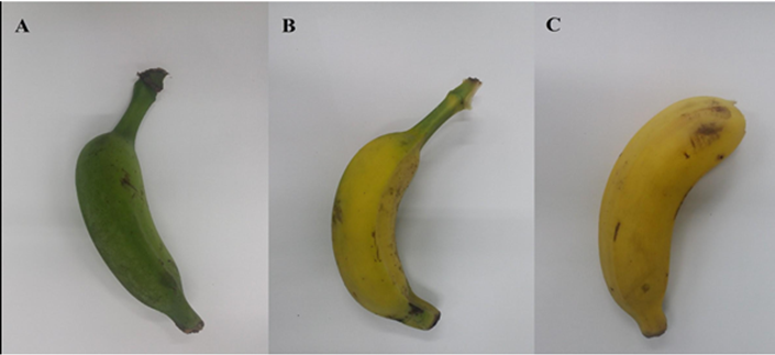 Banana (Musa acuminate) is considered one of the most consumed fruits in the world because of its rich nutritional value and its flavor. For these reasons, banana production is one of the biggest and most lucrative fruit in many countries. Considering the weather sensitive nature of the product, the determination of ripening stage is crucial, ensuring the quality of the product and preventing post-harvest losses.1 Generally, a climacteric fruit has a high respiratory rate and a high ethylene production in the beginning of the post-harvest ripening process, which loss of rigidity and the presence of signs of enzymatic browning while starch is transformed into simple carbohydrates.2,3 Most biochemical methods of assessing the ripening process are limited by processing times and the requirement for expensive laboratory equipment and destruction of the fruit.4 To avoid losses in the determination of the ripening quality of banana fruits during the ripening treatment, a non-destructive detecting method are required.5–7 The ideal time of harvest usually takes place during the initial ripening stages, while the fruit still displays a green coloration. The first observable sign of ripening is a color change from green to yellow, that are described based on Von Loesecke scale classification,8 which describes the visual properties of each stage in the post-harvest ripening process. Therefore, the use of only human visual inspection can result in significant discrepancies, labour-intensive process, interpersonal variation in the analysis and commercial losses.