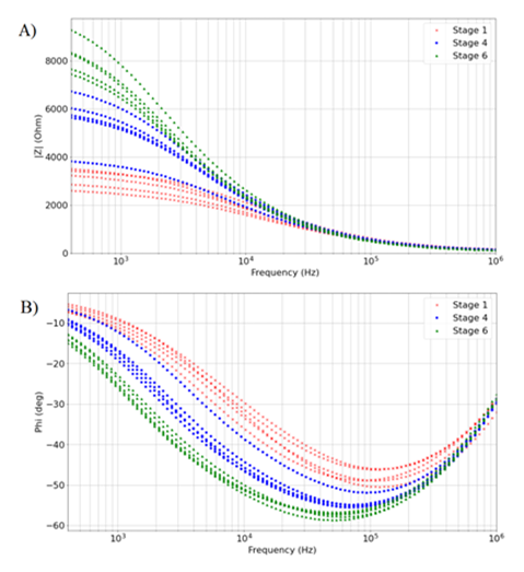 Data was extracted from 30 bananas (Musa acuminate) obtained from local producers (Santa Catarina, Brazil). Ripeness stage was established using the Von Loesecke scale by visual analysis. Nine banana samples were classified as Stage 1 (exemplified in Figure 1A), 11 samples at Stage 4 (Figure 1B) and 10 samples at Stage 6 (Figure 1C). After visual analysis, EIS data was collected from each sample utilizing 4 conductive needles (15 mm long), separated by 5mm each other in a 4-pole configuration by inserting it into the sampled tissue. A sinusoidal voltage of 10Vp over a frequency from 50 Hz to 1 MHz (100 points logarithmically spaced) was used to excite samples and the current was measured by the HF12S Impedance Spectroscope manufactured by Zurich Instruments. Data is exported to a personal computer to a CSV file containing the impedance modulus and phase angle, resulting in a 200 measured points for each sample. Data preprocessing is performed using the Pandas Python library16 consisting of data normalization without the use of dimensionality reduction. From the 30 samples obtained, 16 were separated for the SVM training process and 14 as a testing pool for the algorithm. The SVM classifier was implemented with the use of the Sci-Kit Learn Python library in both linear and polynomial (to the third degree) kernels.