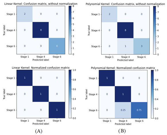 Impedance data collected from samples shows clearly that different ripening stages are reflected in both absolute impedance (Figure 2A) and phase angle (Figure 2B) all along the frequency range. It is possible to infer from graphical analysis of the data obtained that the ripening stages are clearly differentiable from each other in terms of their electrical impedance. Figure 2 represents 5 randomly selected samples obtained from the measurements. A clear difference in the impedance modulus can be observed, especially in lower frequencies. It can be inferred that a computational intelligence algorithm would be able to separate each Stage, since there is a clear distinction between the curves obtained. Both linear and polynomial SVM classifier is trained on the gathered data and results are shown in Figure 3. Linear SVM performance achieves an accuracy of 100% on the determined test set, while the polynomial SVM achieves 92.8 5%. Misclassification by the polynomial SVM occurs as a mix up between stages 2 and 3 and is likely due to edge cases. The confusion matrix, which is represented by Figure 3, confirm that the polynomial Kernel classifier is less accurate compared to the linear Kernel one, whether using normalization or not.